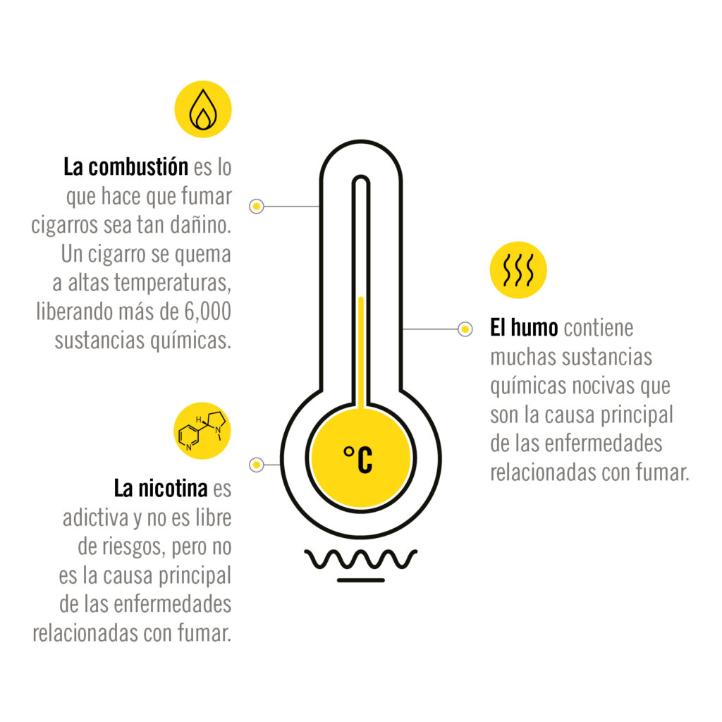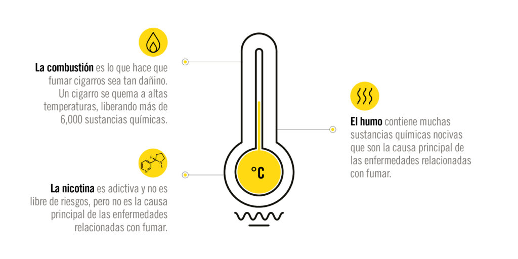 Cuando se elimina el proceso de combustión, se puede reducir la exposición al daño considerablemente. Por ejemplo, los productos libres de humo producen niveles más bajos de sustancias químicas en comparación con los cigarros, ya que, al no existir el proceso de combustión no se produce humo.